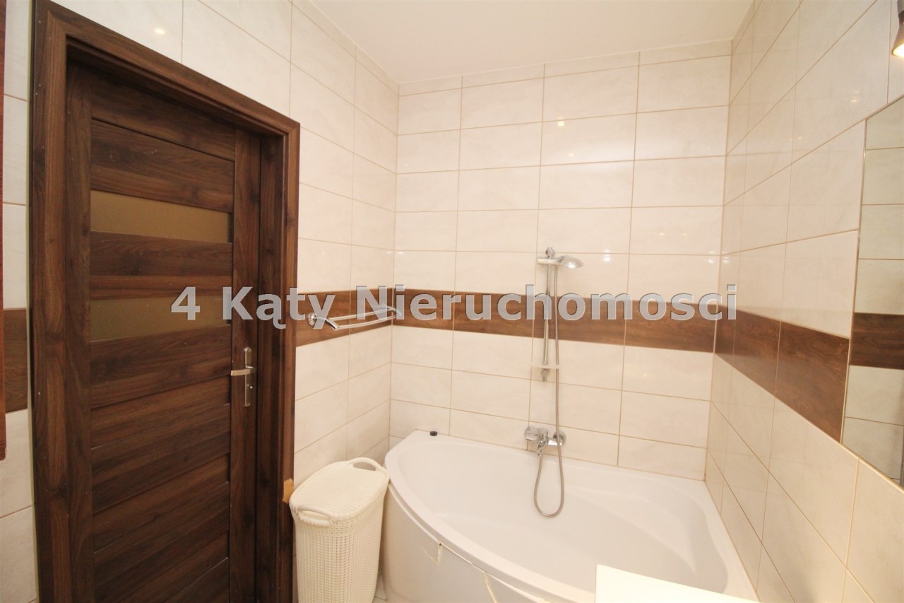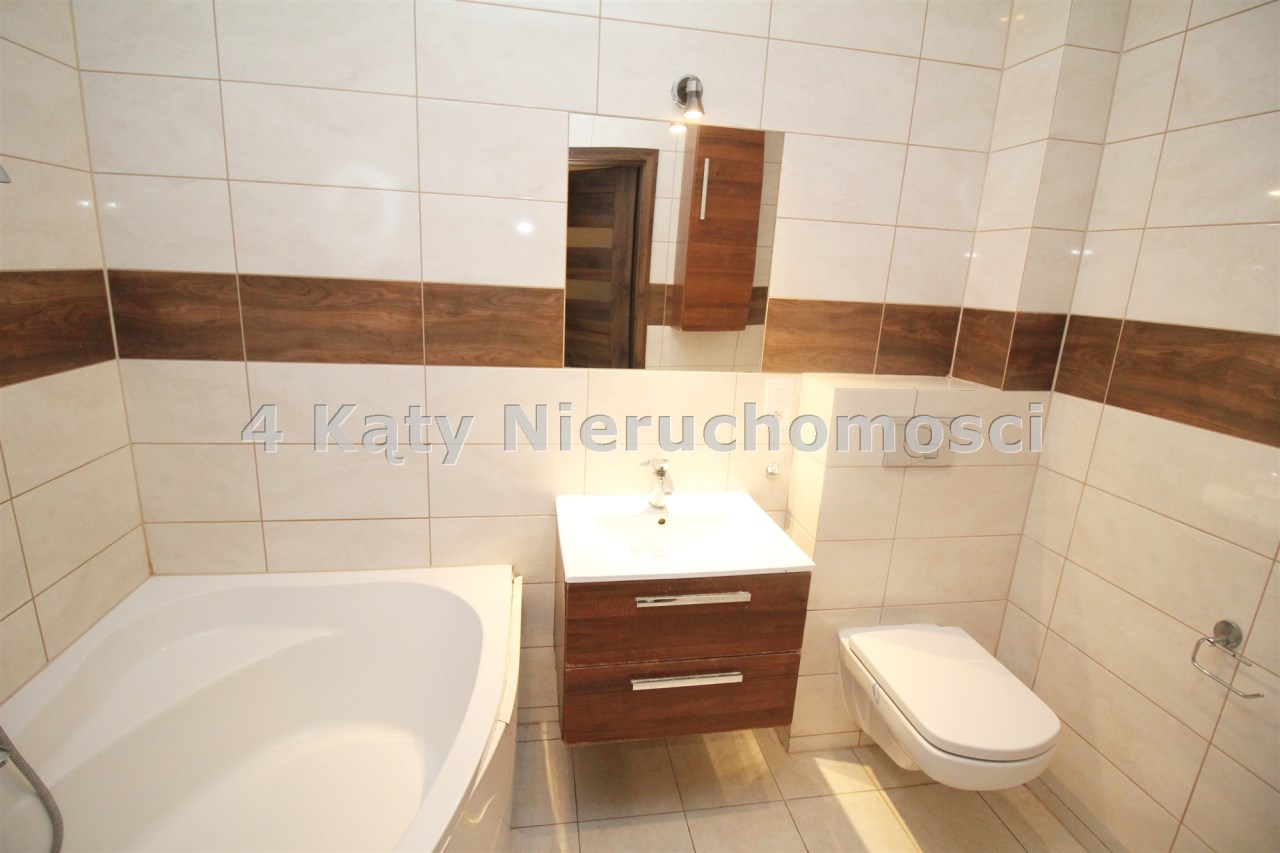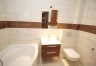 Łazienka została wykończona w płytkach i wyposażona w wannę.