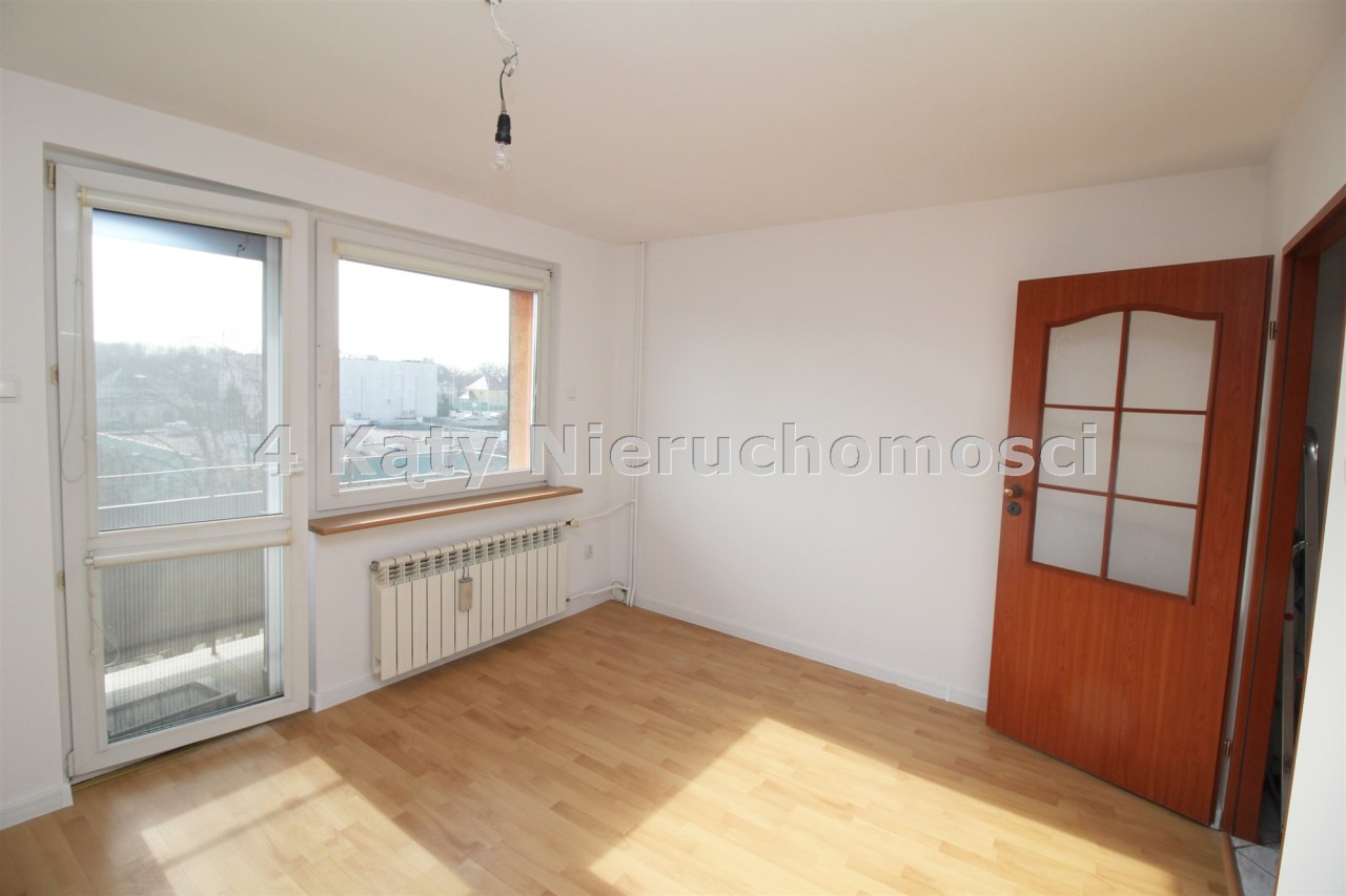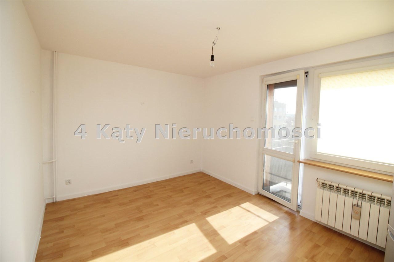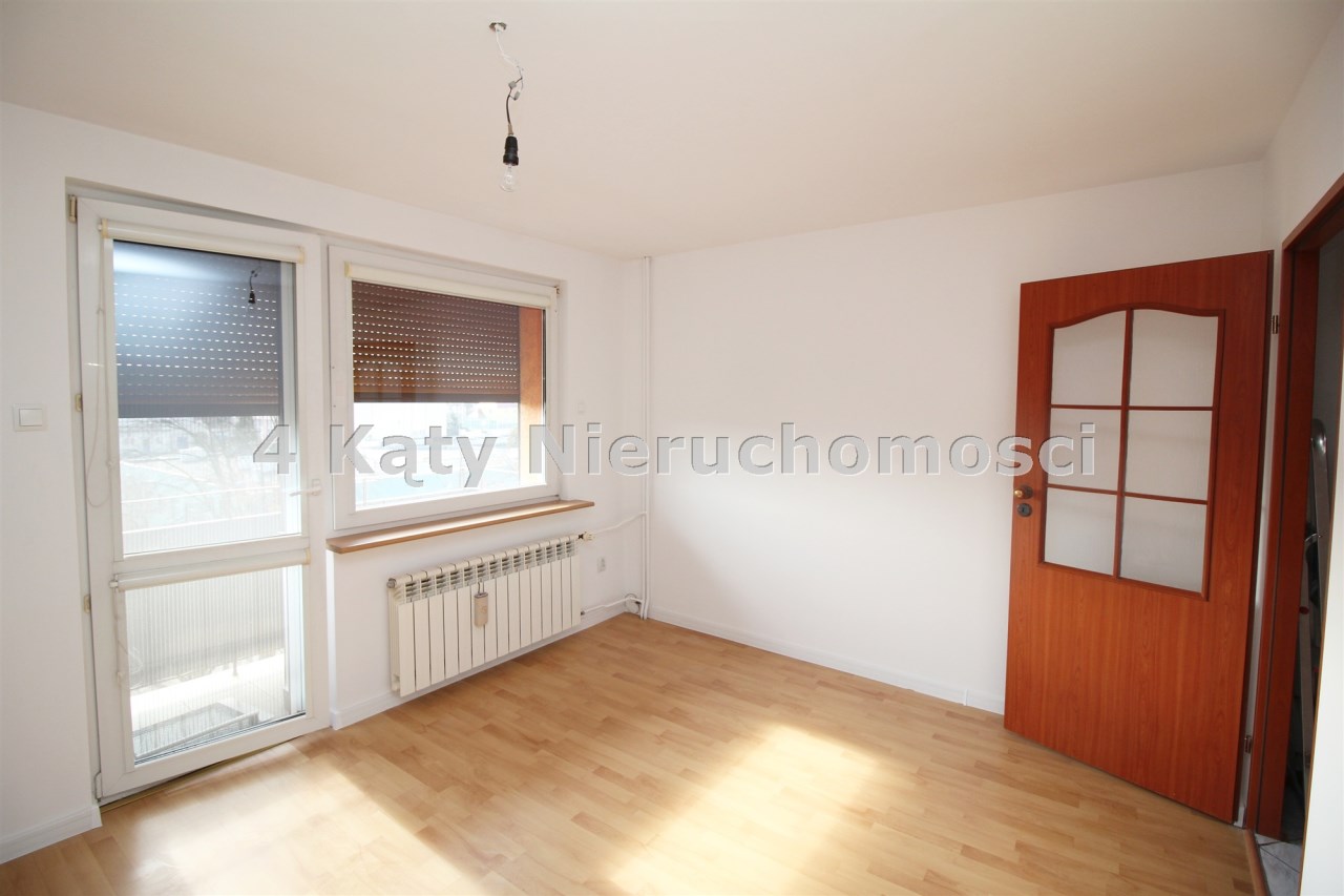 Okna PCV z roletkami wewnętrznymi oraz okno balkonowe wyposażone jest w roletą zewnętrzną zasilaną elektrycznie. Na podłogach znajdują się panele oraz mozaika drewniana.