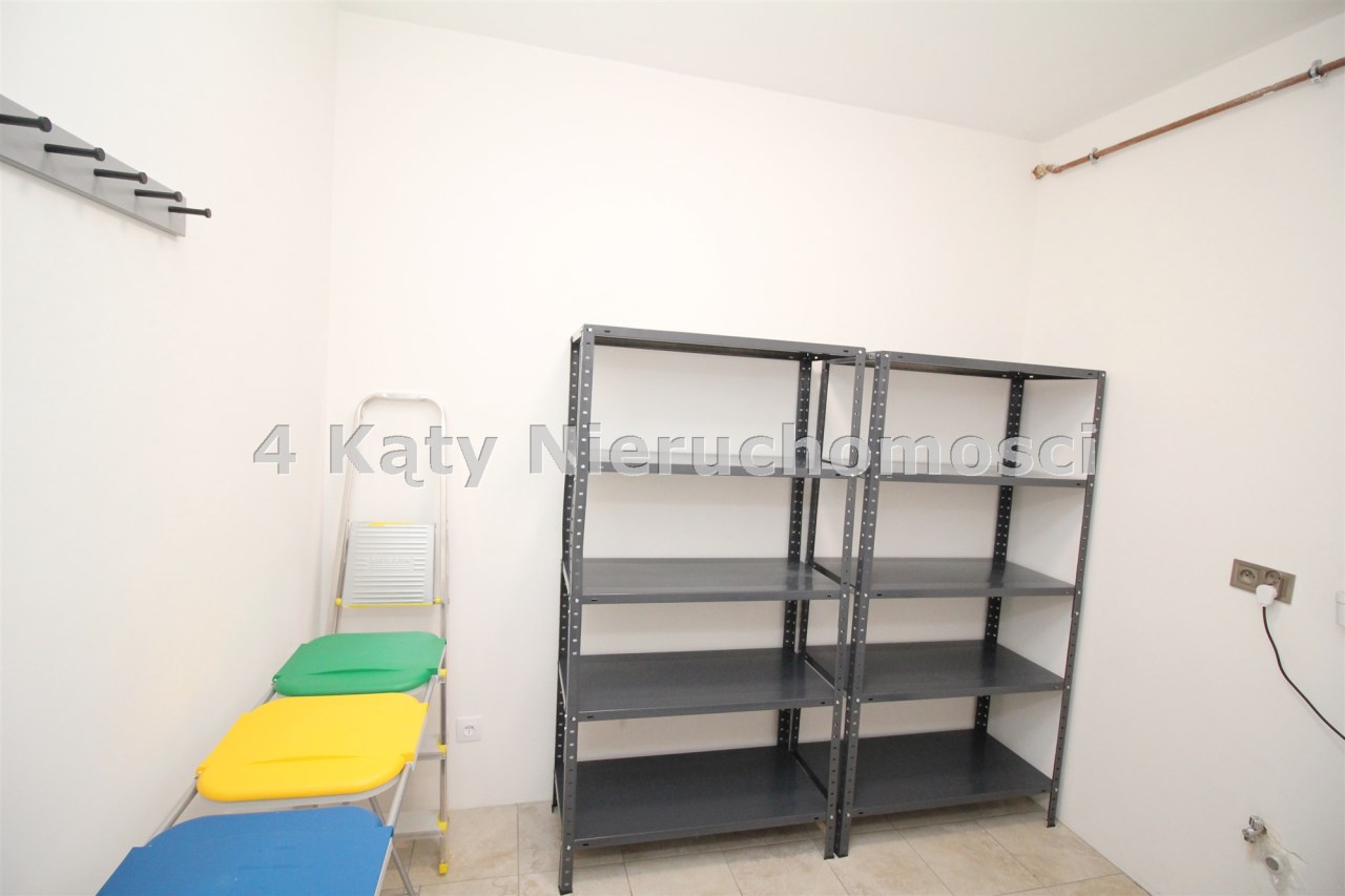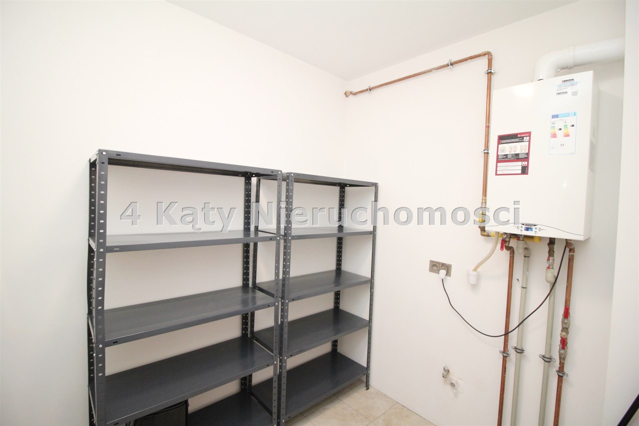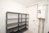 Obszerne pomieszczenie gospodarcze służy jako strefa techniczna i doskonałe miejsce do przechowywania wyposażone w regały.
