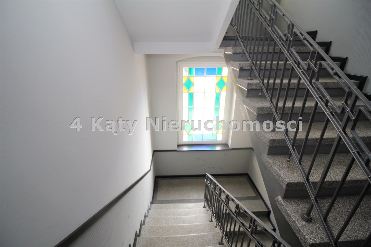 Klatka schodowa po pełnej modernizacji z zachowanymi oryginalnymi elementami pierwotnego wystroju jak okna witrażowe.