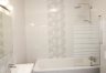 Łazienka wykończona nowoczesną glazurą oraz wyposażona w wannę z możliwością prysznica. Dodatkowo w łazience zainstalowano umywalkę z lustrem i grzejnik drabinkowy oraz pralko-suszarkę + ogrzewanie podłogowe. W całym mieszkaniu zainstalowano energooszczędne oświetlenie ledowe.